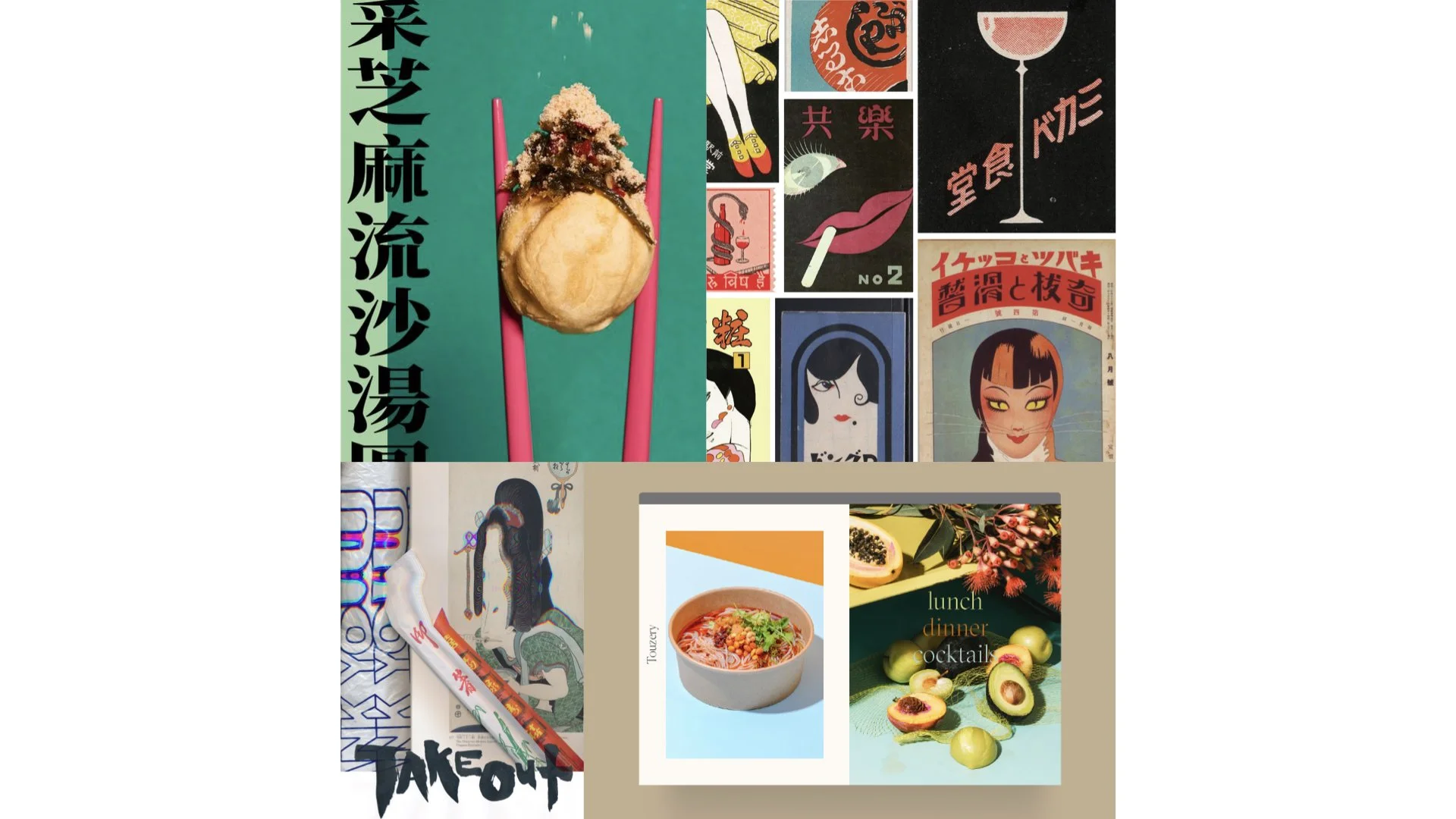 THROUGH THIS EXPLORATION i TURNED TAKEOUT INTO A PERSONAL RESTAURANT BRANDING PROJECT. takeoutS BRANDING uses my personal collection of VINTAGE AND MODERN takeout ephemera I’ve collected over the years (menus, napkins, posters, utensils, bags, stickers etc.) MIXED WITH HAND drawn elements and an edgy visual identity.